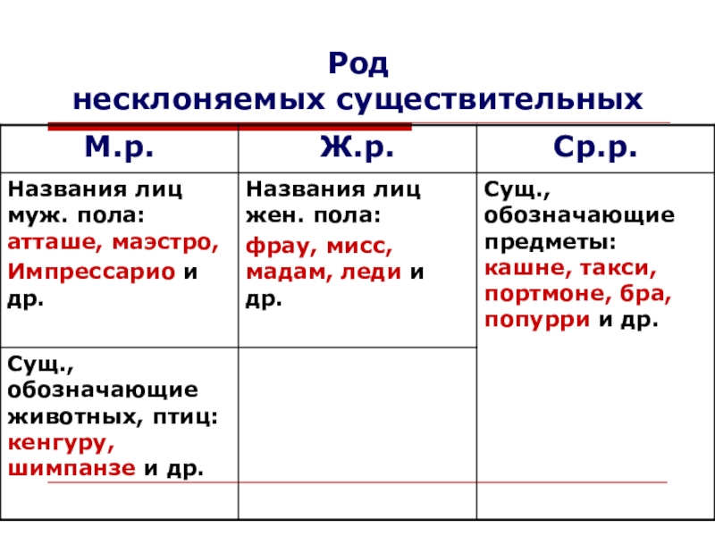 стол (твердая основа и нулевое окончание), хотя заведение; дот — м.р., хотя точка; Субстантивированные несклоняемые слова имеют средний род: Далече грянуло ура; наше сегодня и завтра.