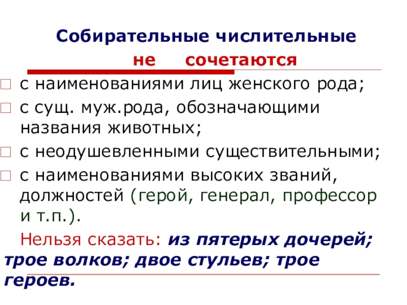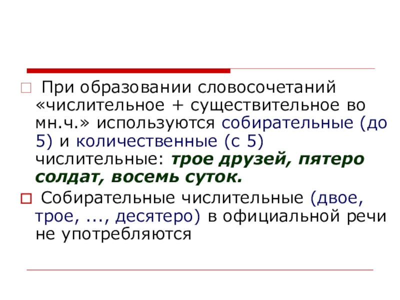(до 5) и количественные (с 5) числительные: трое друзей, пятеро солдат, восемь суток.