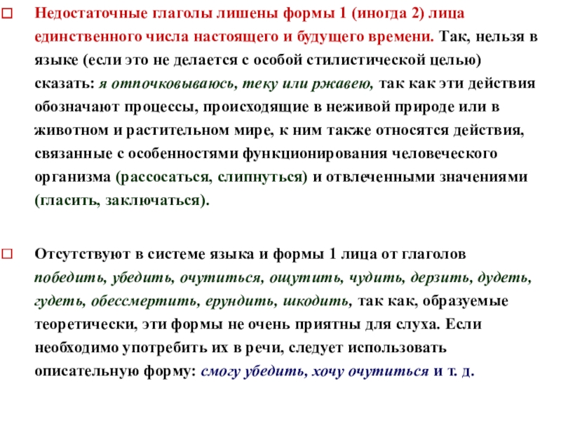 Недостаточные глаголы лишены формы 1 (иногда 2) лица единственного числа настоящего