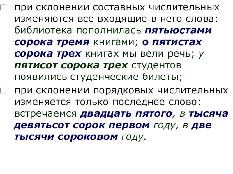 при склонении составных числительных изменяются все входящие в него слова: библиотека