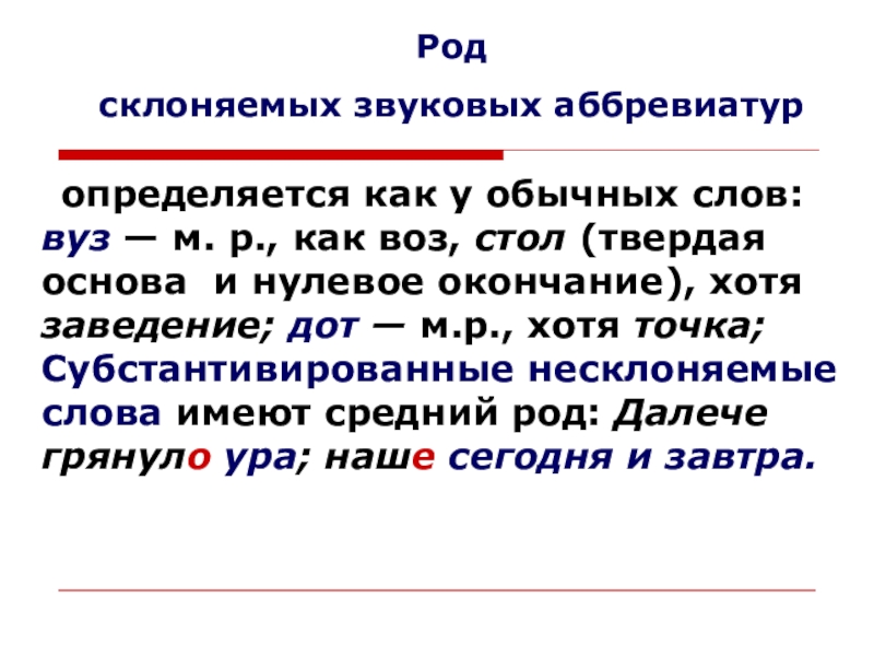 Слайд 14определяется как у обычных слов: вуз — м. р., как воз,