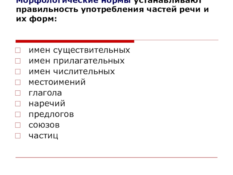 Слайд 3Морфологические нормы устанавливают правильность употребления частей речи и их форм: