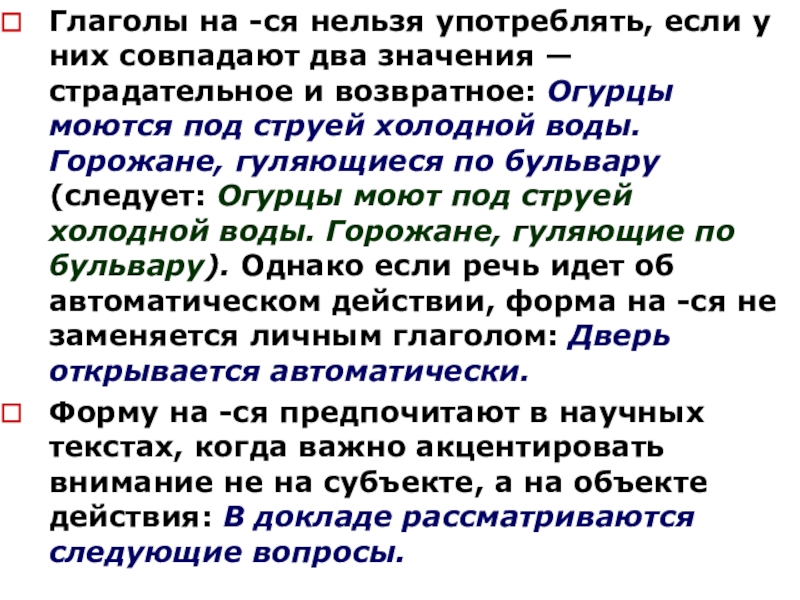 — страдательное и возвратное: Огурцы моются под струей холодной воды. Горожане, гуляющиеся по бульвару (следует: Огурцы моют под струей холодной воды. Горожане, гуляющие по бульвару). Однако если речь идет об автоматическом действии, форма на -ся не заменяется личным глаголом: Дверь открывается автоматически.