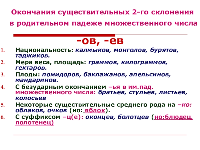 Слайд 18Окончания существительных 2-го склонения в родительном падеже множественного числа