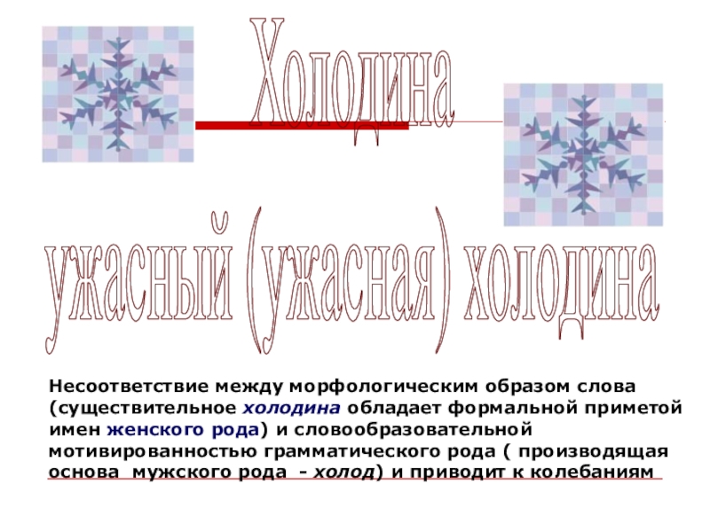 приметой имен женского рода) и словообразовательной мотивированностью грамматического рода ( производящая основа мужского рода - холод) и приводит к колебаниям