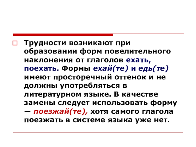 Трудности возникают при образовании форм повелительного наклонения от глаголов ехать, поехать.