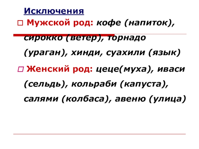 Мужской род: кофе (напиток), сирокко (ветер), торнадо (ураган), хинди, суахили