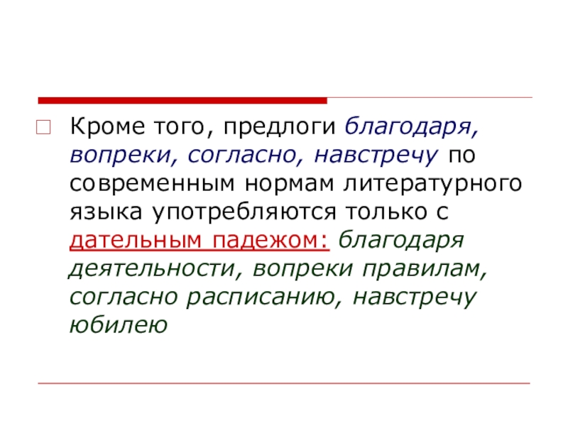 Кроме того, предлоги благодаря, вопреки, согласно, навстречу по современным нормам литературного