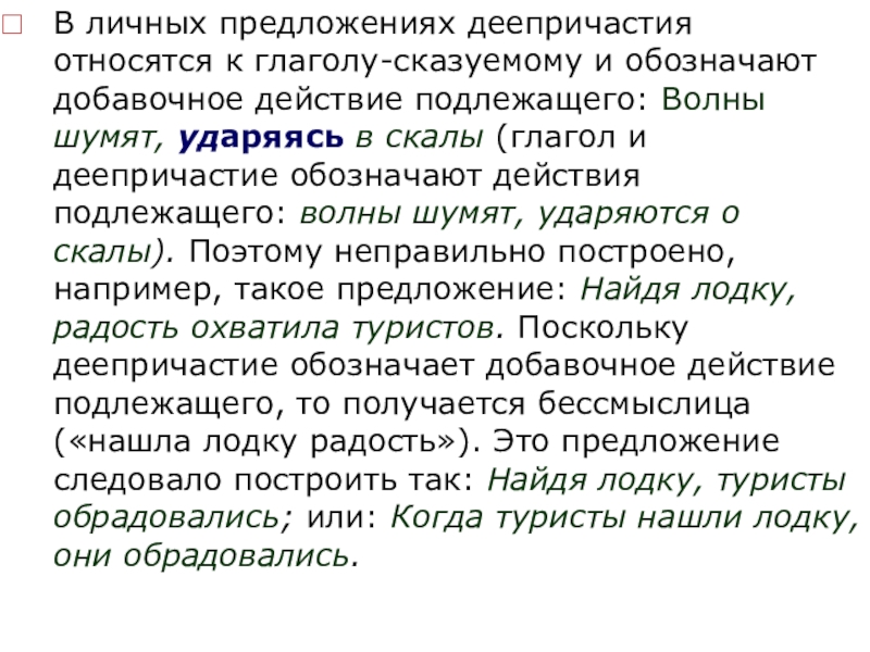подлежащего: Волны шумят, ударяясь в скалы (глагол и деепричастие обозначают действия подлежащего: волны шумят, ударяются о скалы). Поэтому неправильно построено, например, такое предложение: Найдя лодку, радость охватила туристов. Поскольку деепричастие обозначает добавочное действие подлежащего, то получается бессмыслица («нашла лодку радость»). Это предложение следовало построить так: Найдя лодку, туристы обрадовались; или: Когда туристы нашли лодку, они обрадовались.