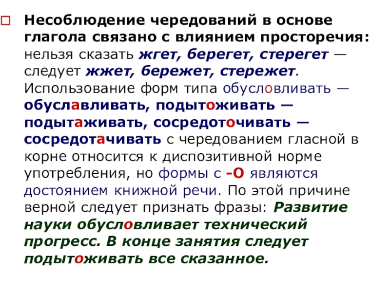 жгет, берегет, стерегет — следует жжет, бережет, стережет. Использование форм типа обусловливать — обуславливать, подытоживать — подытаживать, сосредоточивать — сосредотачивать с чередованием гласной в корне относится к диспозитивной норме употребления, но формы с -О являются достоянием книжной речи. По этой причине верной следует признать фразы: Развитие науки обусловливает технический прогресс. В конце занятия следует подытоживать все сказанное.