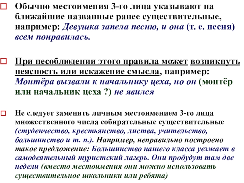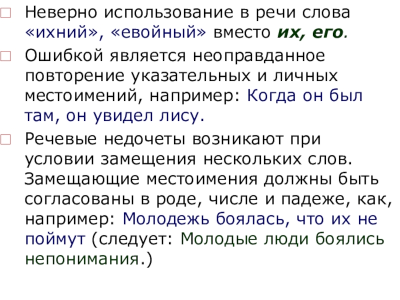 Речевые недочеты возникают при условии замещения нескольких слов. Замещающие местоимения должны быть согласованы в роде, числе и падеже, как, например: Молодежь боялась, что их не поймут (следует: Молодые люди боялись непонимания.)