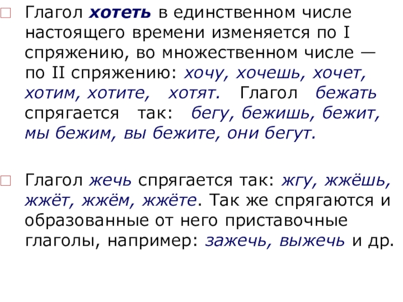 во множественном числе — по II спряжению: хочу, хочешь, хочет, хотим, хотите, хотят. Глагол бежать спрягается так: бегу, бежишь, бежит, мы бежим, вы бежите, они бегут.
