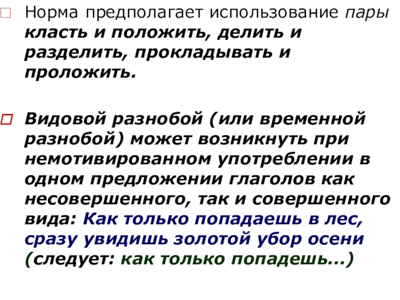 Видовой разнобой (или временной разнобой) может возникнуть при немотивированном употреблении в одном предложении глаголов как несовершенного, так и совершенного вида: Как только попадаешь в лес, сразу увидишь золотой убор осени (следует: как только попадешь...)