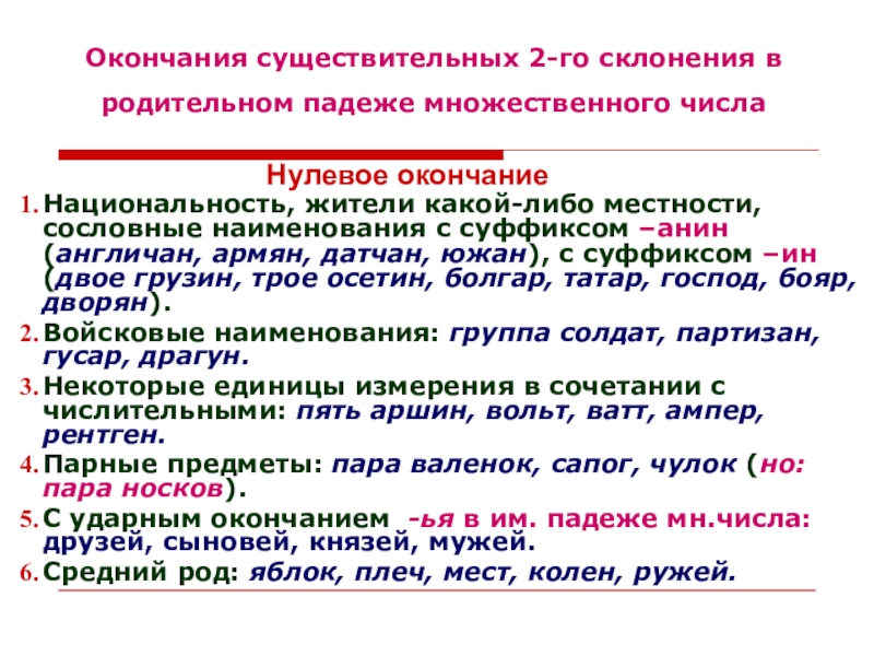 местности, сословные наименования с суффиксом –анин (англичан, армян, датчан, южан), с суффиксом –ин (двое грузин, трое осетин, болгар, татар, господ, бояр, дворян).