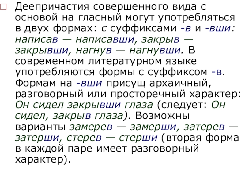 формах: с суффиксами -в и -вши: написав — написавши, закрыв — закрывши, нагнув — нагнувши. В современном литературном языке употребляются формы с суффиксом -в. Формам на -вши присущ архаичный, разговорный или просторечный характер: Он сидел закрывши глаза (следует: Он сидел, закрыв глаза). Возможны варианты замерев — замерши, затерев — затерши, стерев — стерши (вторая форма в каждой паре имеет разговорный характер).