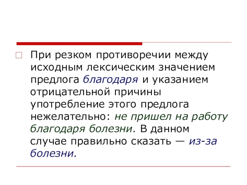 отрицательной причины употребление этого предлога нежелательно: не пришел на работу благодаря болезни. В данном случае правильно сказать — из-за болезни.