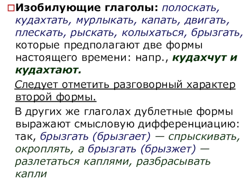 Изобилующие глаголы: полоскать, кудахтать, мурлыкать, капать, двигать, плескать, рыскать, колыхаться, брызгать,
