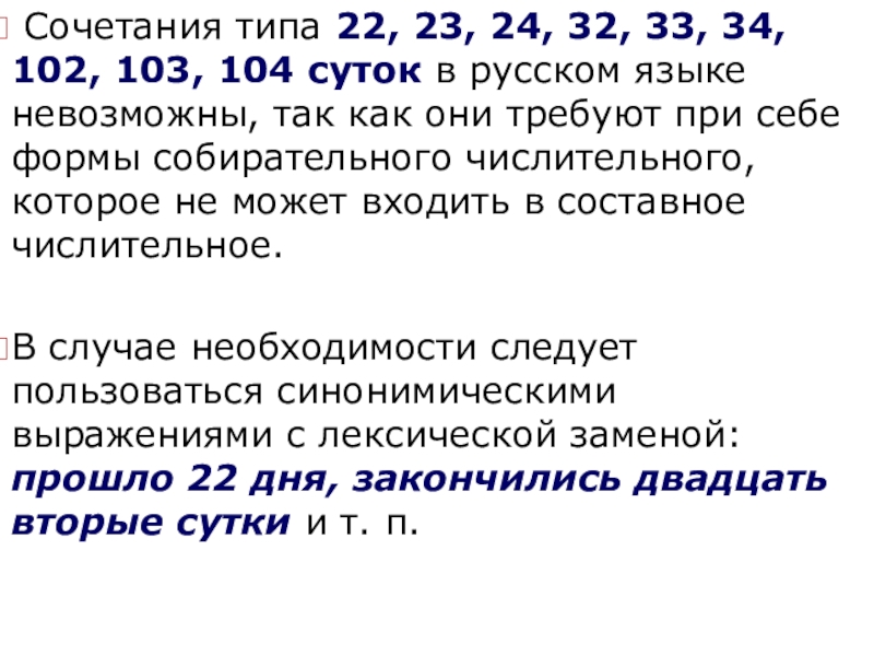 В случае необходимости следует пользоваться синонимическими выражениями с лексической заменой: прошло 22 дня, закончились двадцать вторые сутки и т. п.