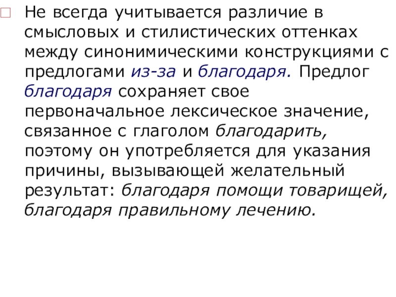 конструкциями с предлогами из-за и благодаря. Предлог благодаря сохраняет свое первоначальное лексическое значение, связанное с глаголом благодарить, поэтому он употребляется для указания причины, вызывающей желательный результат: благодаря помощи товарищей, благодаря правильному лечению.