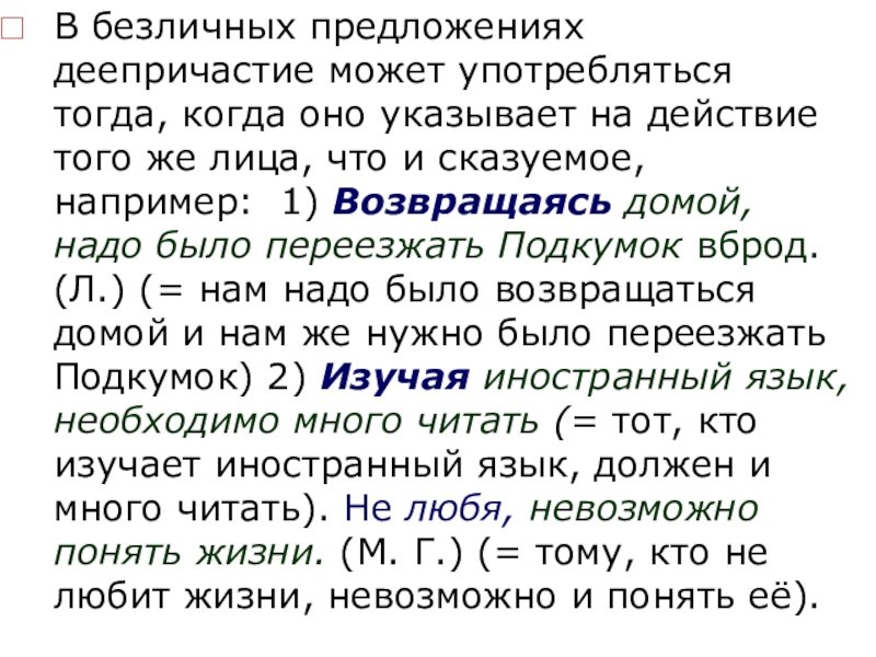 действие того же лица, что и сказуемое, например: 1) Возвращаясь домой, надо было переезжать Подкумок вброд. (Л.) (= нам надо было возвращаться домой и нам же нужно было переезжать Подкумок) 2) Изучая иностранный язык, необходимо много читать (= тот, кто изучает иностранный язык, должен и много читать). Не любя, невозможно понять жизни. (М. Г.) (= тому, кто не любит жизни, невозможно и понять её).