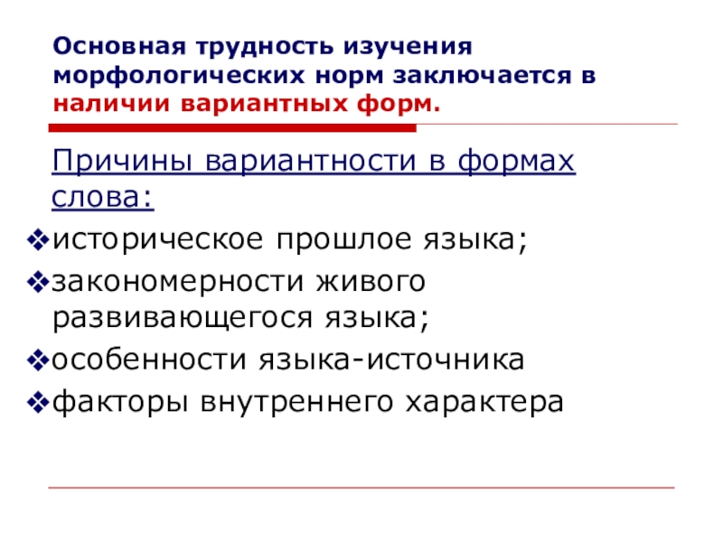 Слайд 4Основная трудность изучения морфологических норм заключается в наличии вариантных форм.