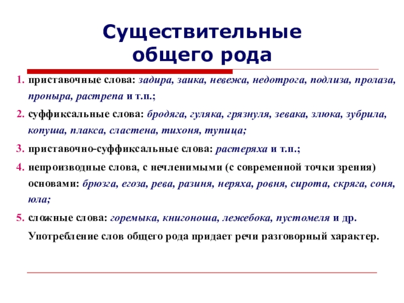 непроизводные слова, с нечленимыми (с современной точки зрения) основами: брюзга, егоза, рева, разиня, неряха, ровня, сирота, скряга, соня, юла;