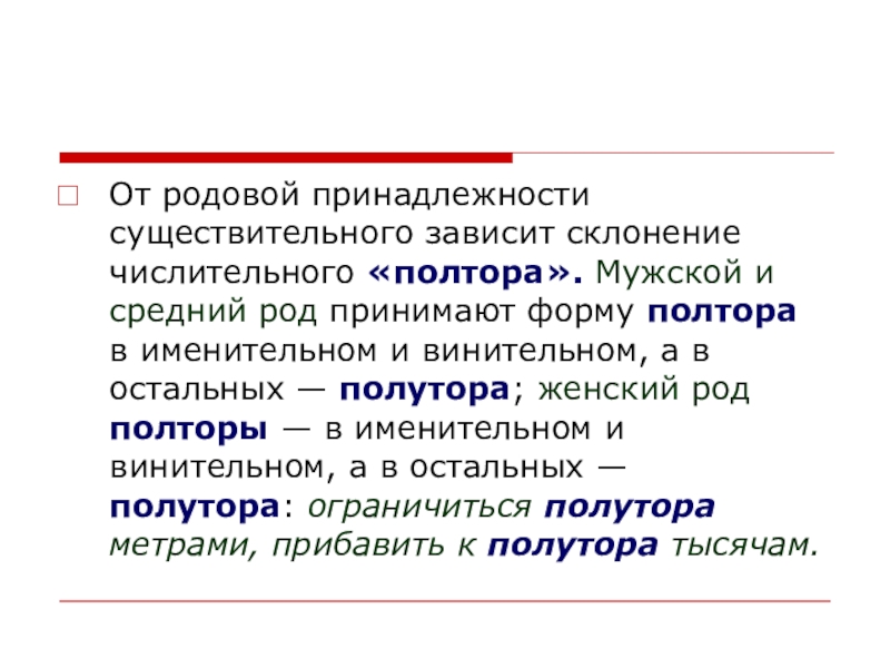 род принимают форму полтора в именительном и винительном, а в остальных — полутора; женский род полторы — в именительном и винительном, а в остальных — полутора: ограничиться полутора метрами, прибавить к полутора тысячам.