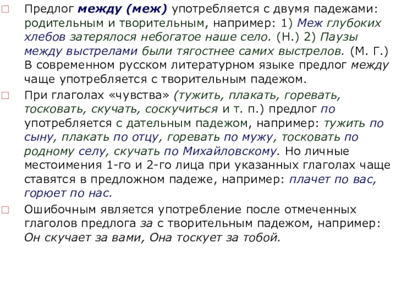 1) Меж глубоких хлебов затерялося небогатое наше село. (Н.) 2) Паузы между выстрелами были тягостнее самих выстрелов. (М. Г.) В современном русском литературном языке предлог между чаще употребляется с творительным падежом.