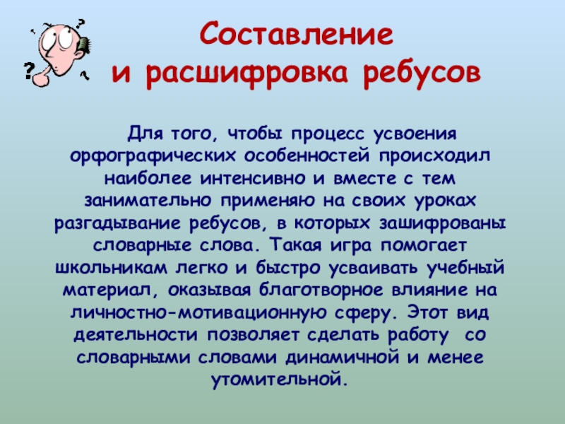 усвоения орфографических особенностей происходил наиболее интенсивно и вместе с тем занимательно применяю на своих уроках разгадывание ребусов, в которых зашифрованы словарные слова. Такая игра помогает школьникам легко и быстро усваивать учебный материал, оказывая благотворное влияние на личностно-мотивационную сферу. Этот вид деятельности позволяет сделать работу со словарными словами динамичной и менее утомительной.