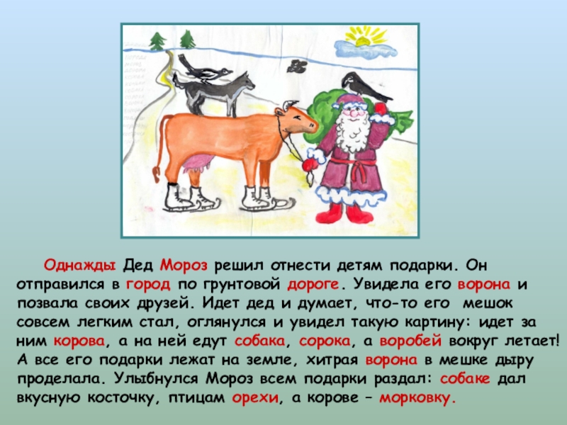 в город по грунтовой дороге. Увидела его ворона и позвала своих друзей. Идет дед и думает, что-то его мешок совсем легким стал, оглянулся и увидел такую картину: идет за ним корова, а на ней едут собака, сорока, а воробей вокруг летает! А все его подарки лежат на земле, хитрая ворона в мешке дыру проделала. Улыбнулся Мороз всем подарки раздал: собаке дал вкусную косточку, птицам орехи, а корове – морковку.