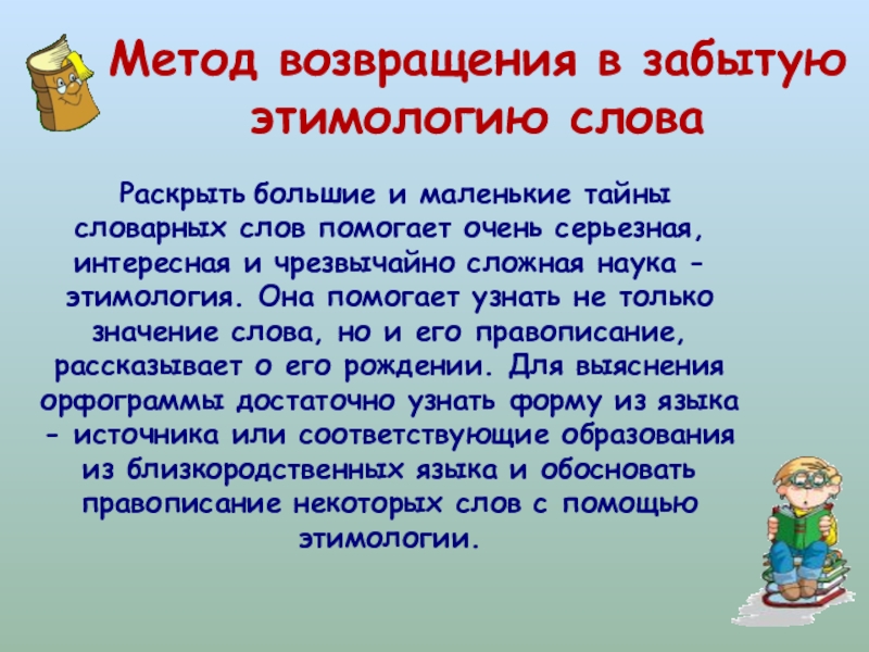словарных слов помогает очень серьезная, интересная и чрезвычайно сложная наука - этимология. Она помогает узнать не только значение слова, но и его правописание, рассказывает о его рождении. Для выяснения орфограммы достаточно узнать форму из языка - источника или соответствующие образования из близкородственных языка и обосновать правописание некоторых слов с помощью этимологии.