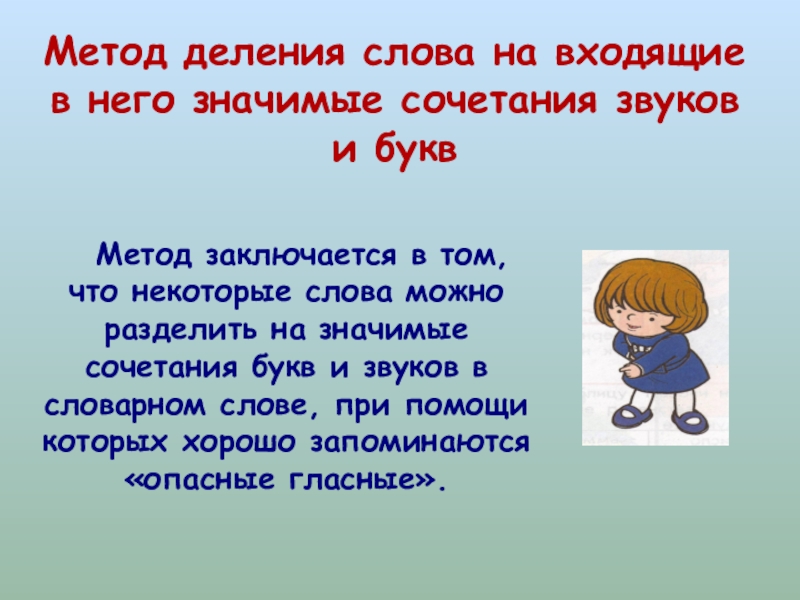 Метод заключается в том, что некоторые слова можно разделить на значимые сочетания букв и звуков в словарном слове, при помощи которых хорошо запоминаются «опасные гласные».