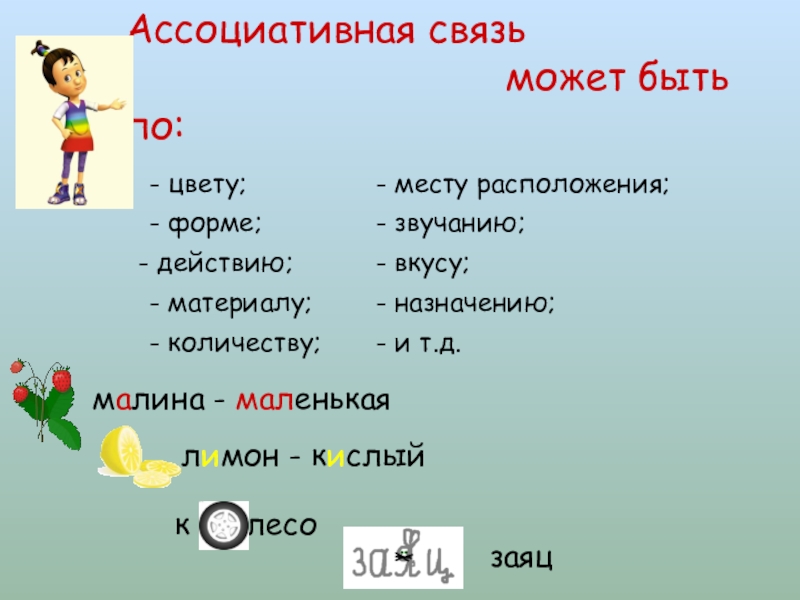 придумать рисунок, обозначающий само слово или интересно обыграть в нем запоминаемую букву. Она может быть письменная или печатная, любого шрифта или размера. Желательно букву изображать по аналогии с внешним видом самого предмета.