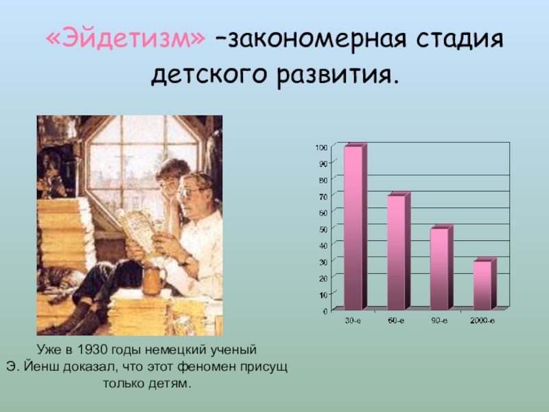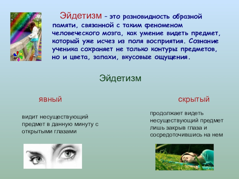 Слайд 6 Эйдетизм – это разновидность образной памяти, связанной с таким