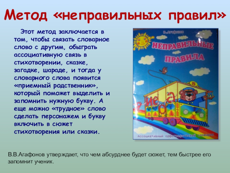 В.В.Агафонов утверждает, что чем абсурднее будет сюжет, тем быстрее его запомнит ученик.