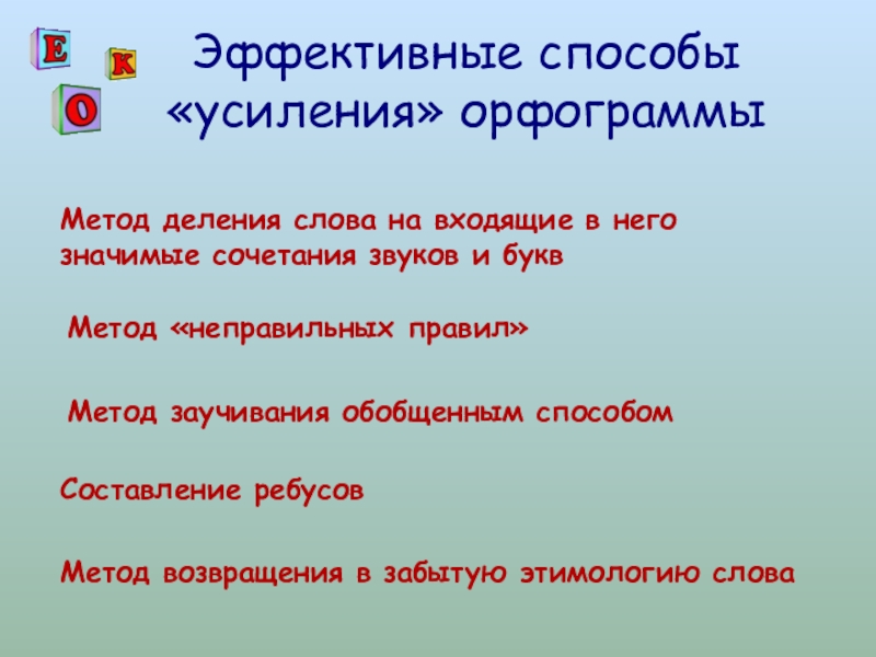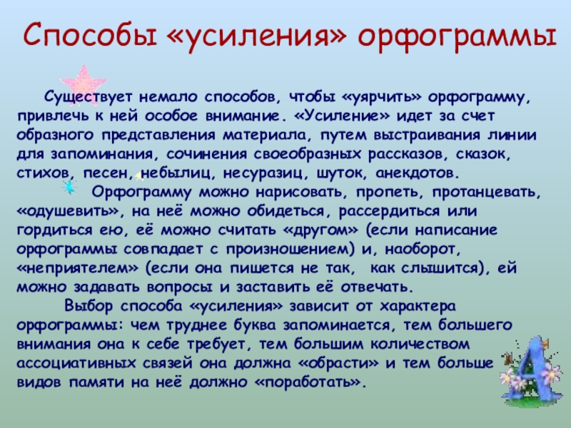 Выбор способа «усиления» зависит от характера орфограммы: чем труднее буква запоминается, тем большего внимания она к себе требует, тем большим количеством ассоциативных связей она должна «обрасти» и тем больше видов памяти на неё должно «поработать».