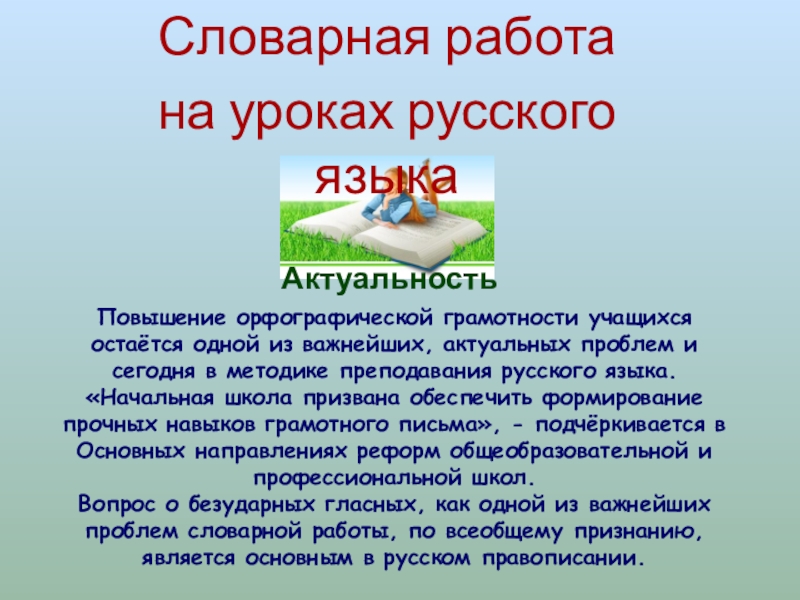 Вопрос о безударных гласных, как одной из важнейших проблем словарной работы, по всеобщему признанию, является основным в русском правописании.