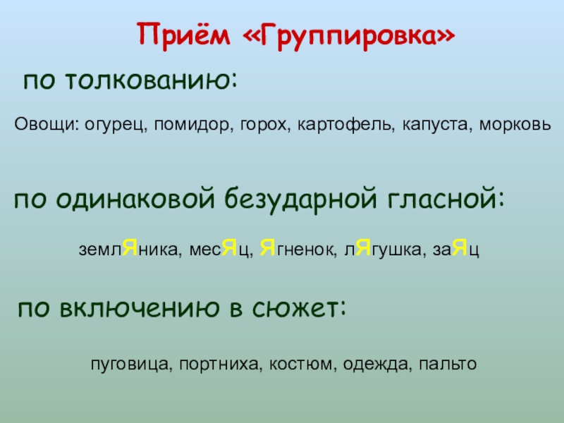 приём «вешалкой»): знаю написание одного слова – «вешаю» на него другие слова, которые пишутся с той же орфограммой.
