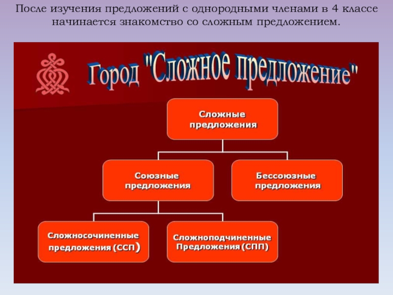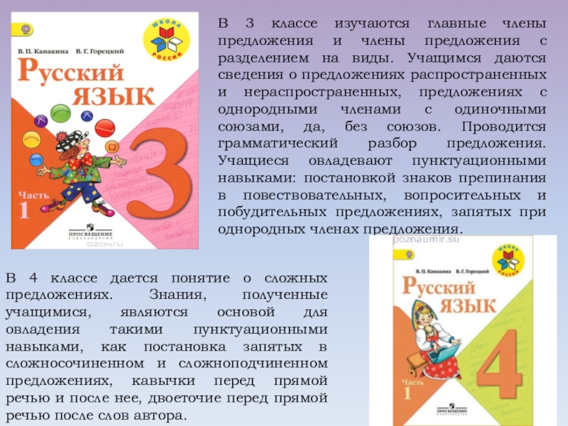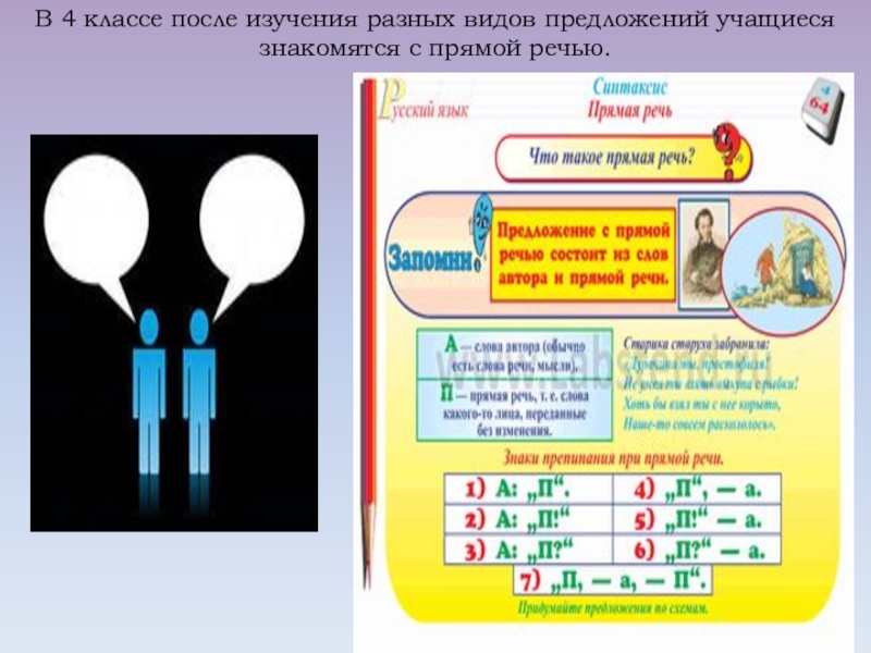 В 4 классе дается понятие о сложных предложениях. Знания, полученные учащимися, являются основой для овладения такими пунктуационными навыками, как постановка запятых в сложносочиненном и сложноподчиненном предложениях, кавычки перед прямой речью и после нее, двоеточие перед прямой речью после слов автора.