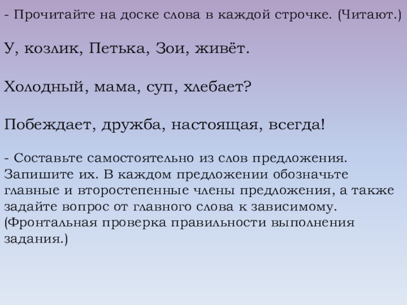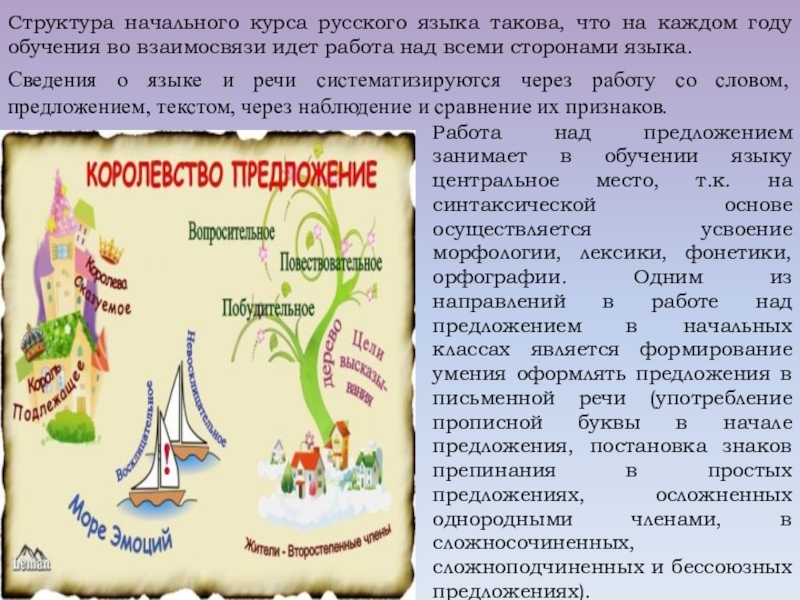 Работа над предложением занимает в обучении языку центральное место, т.к. на синтаксической основе осуществляется усвоение морфологии, лексики, фонетики, орфографии. Одним из направлений в работе над предложением в начальных классах является формирование умения оформлять предложения в письменной речи (употребление прописной буквы в начале предложения, постановка знаков препинания в простых предложениях, осложненных однородными членами, в сложносочиненных, сложноподчиненных и бессоюзных предложениях).
