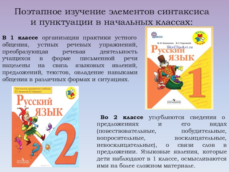 Во 2 классе углубляются сведения о предложениях и его видах (повествовательные, побудительные, вопросительные, восклицательные, невосклицательные), о связи слов в предложении. Языковые явления, которые дети наблюдают в 1 классе, осмысливаются ими на более сложном материале.
