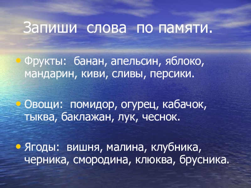 Запиши слова по памяти.Фрукты: банан, апельсин, яблоко, мандарин, киви, сливы, персики.Овощи: помидор, огурец, кабачок, тыква, баклажан, лук,