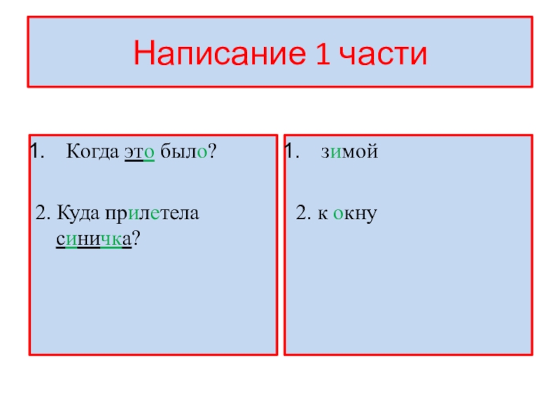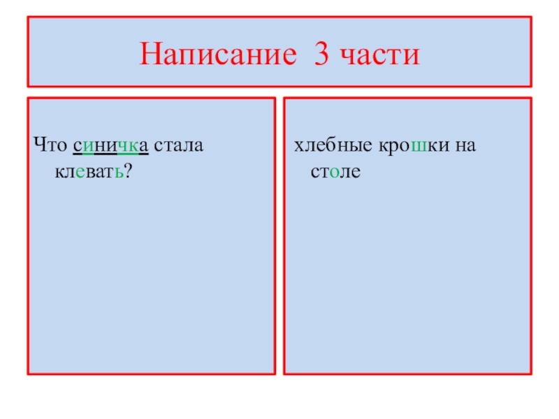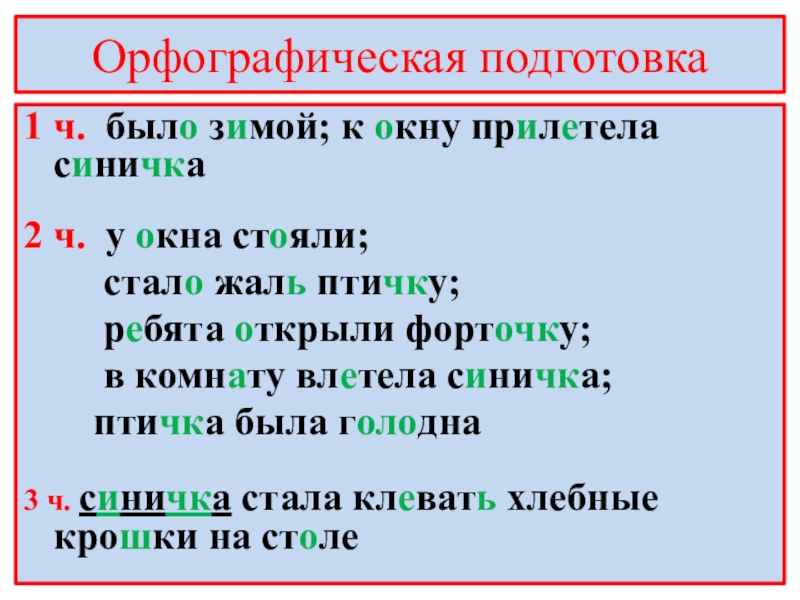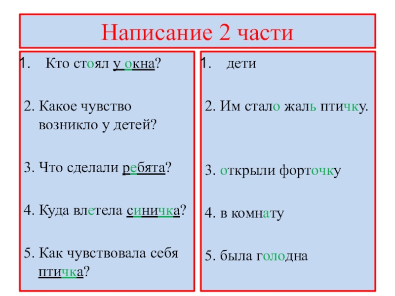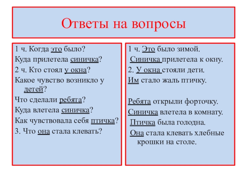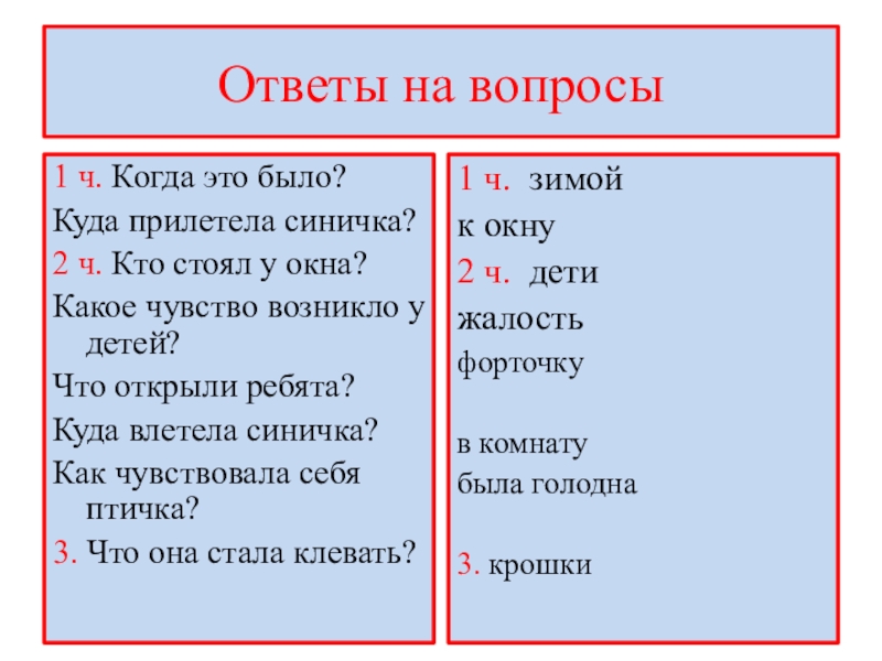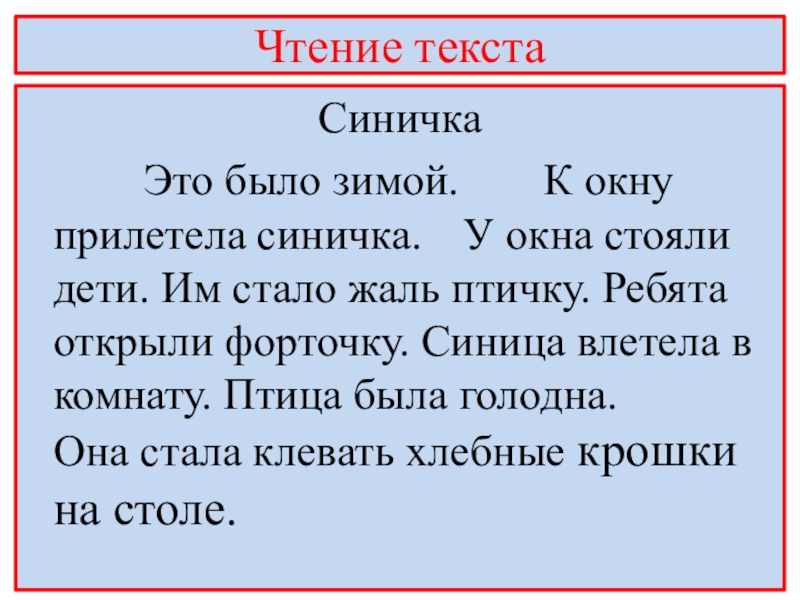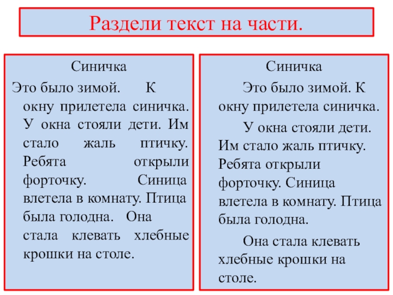 У окна стояли дети. Им стало жаль птичку. Ребята открыли форточку. Синица влетела в комнату. Птица была голодна.