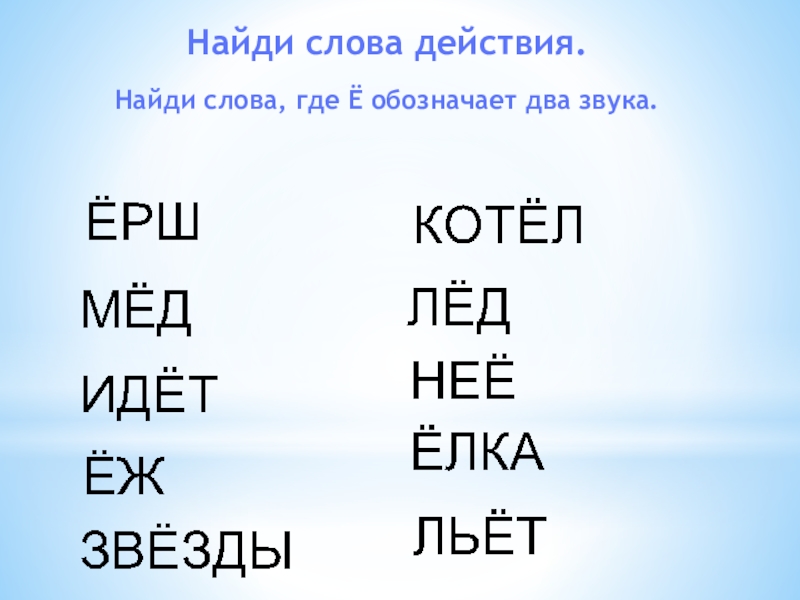 Найди слова действия.Найди слова, где Ё обозначает два звука.