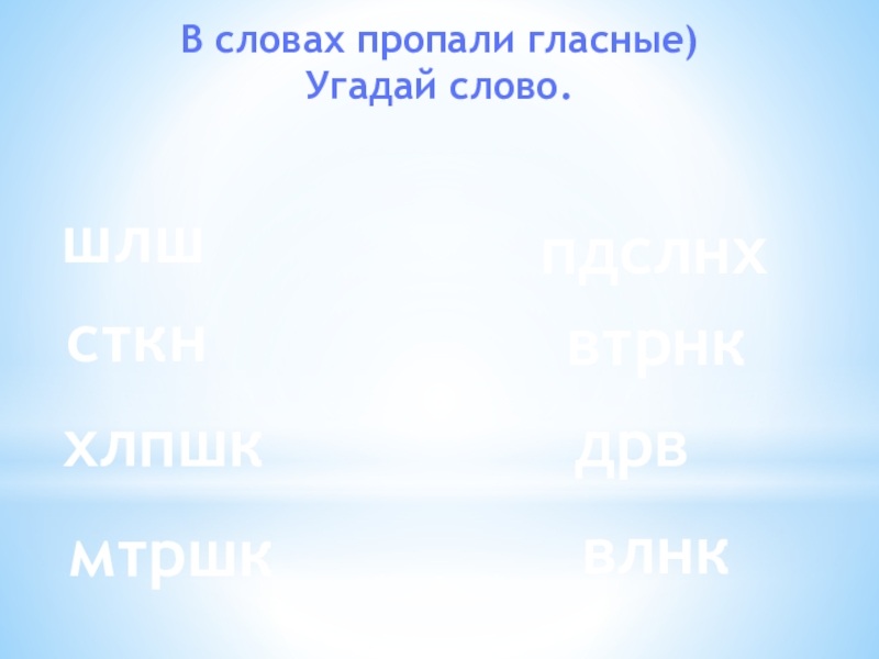 В словах пропали гласные)Угадай слово.шлшсткнхлпшкмтршкпдслнхвтрнкдрввлнк