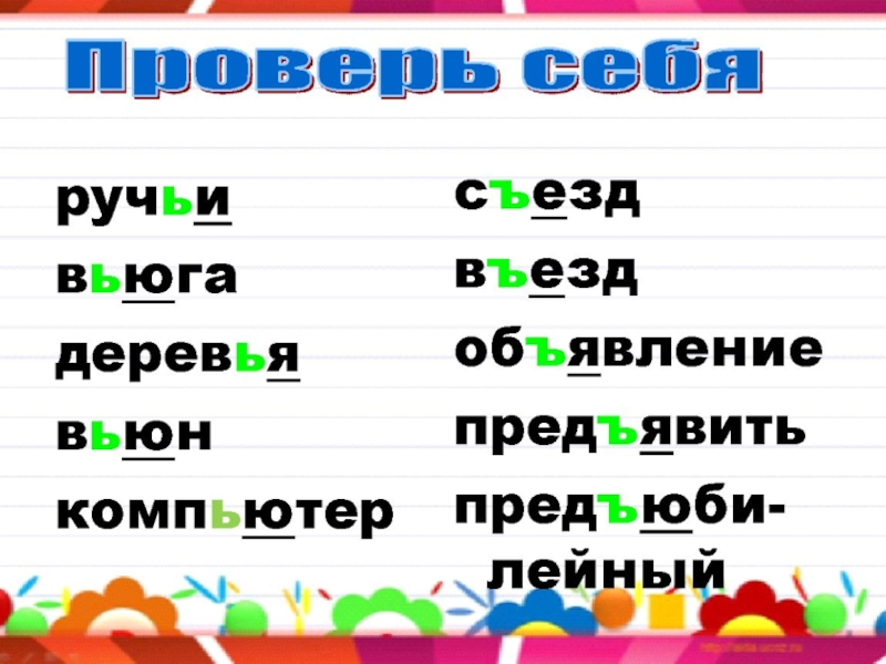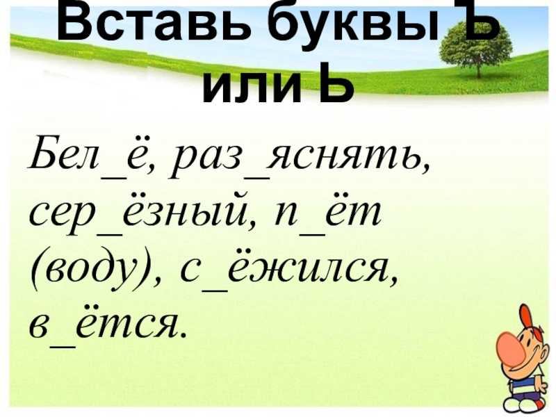 Вставь буквы Ъ или ЬБел_ё, раз_яснять, сер_ёзный, п_ёт (воду), с_ёжился, в_ётся.