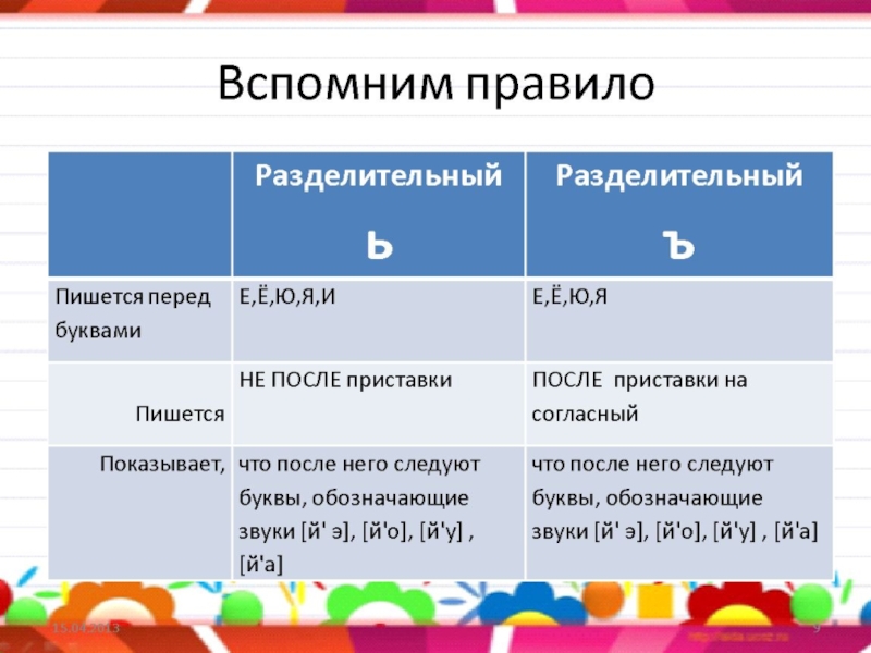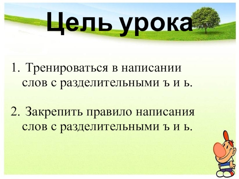 Цель урока Тренироваться в написании слов с разделительными ъ и ь. Закрепить правило написания слов с разделительными