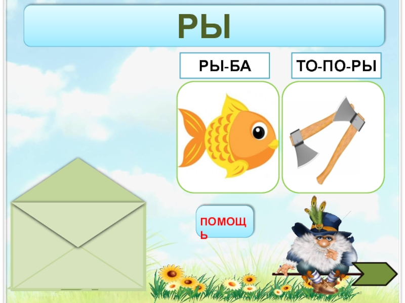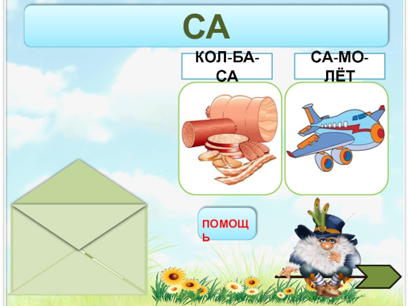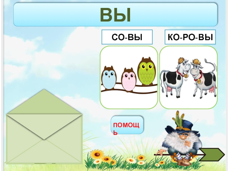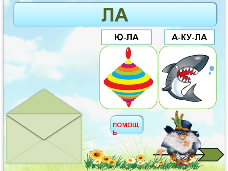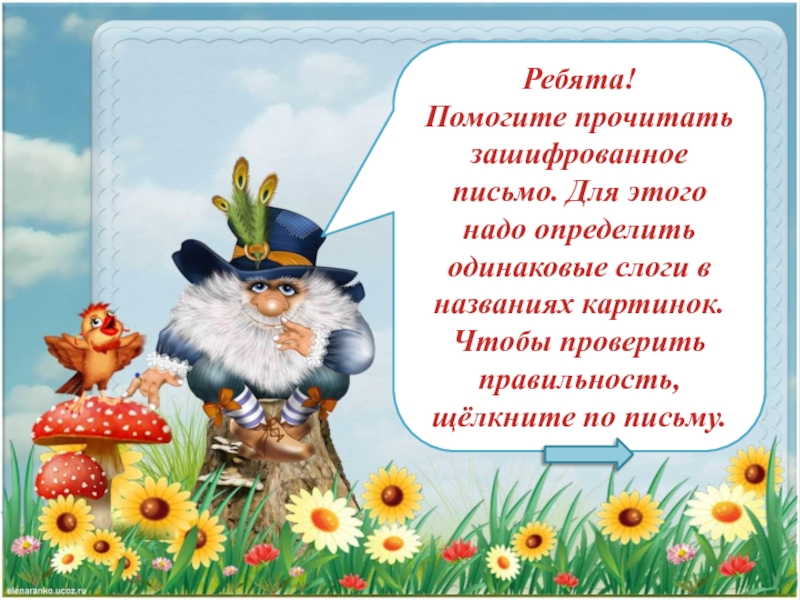 Ребята! Помогите прочитать зашифрованное письмо. Для этого надо определить одинаковые слоги в названиях картинок. Чтобы проверить правильность, щёлкните по письму.