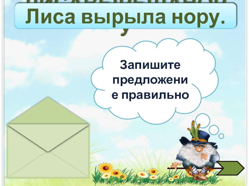 ЛИСАВЫРЫЛАНОРУЗапишите предложение правильноЛиса вырыла нору.