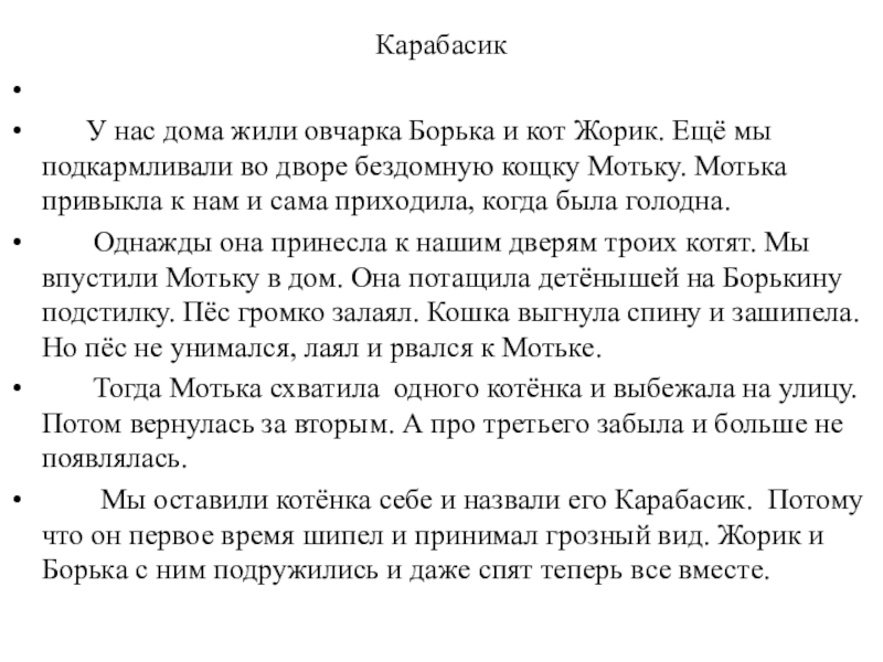 Однажды она принесла к нашим дверям троих котят. Мы впустили Мотьку в дом. Она потащила детёнышей на Борькину подстилку. Пёс громко залаял. Кошка выгнула спину и зашипела. Но пёс не унимался, лаял и рвался к Мотьке.